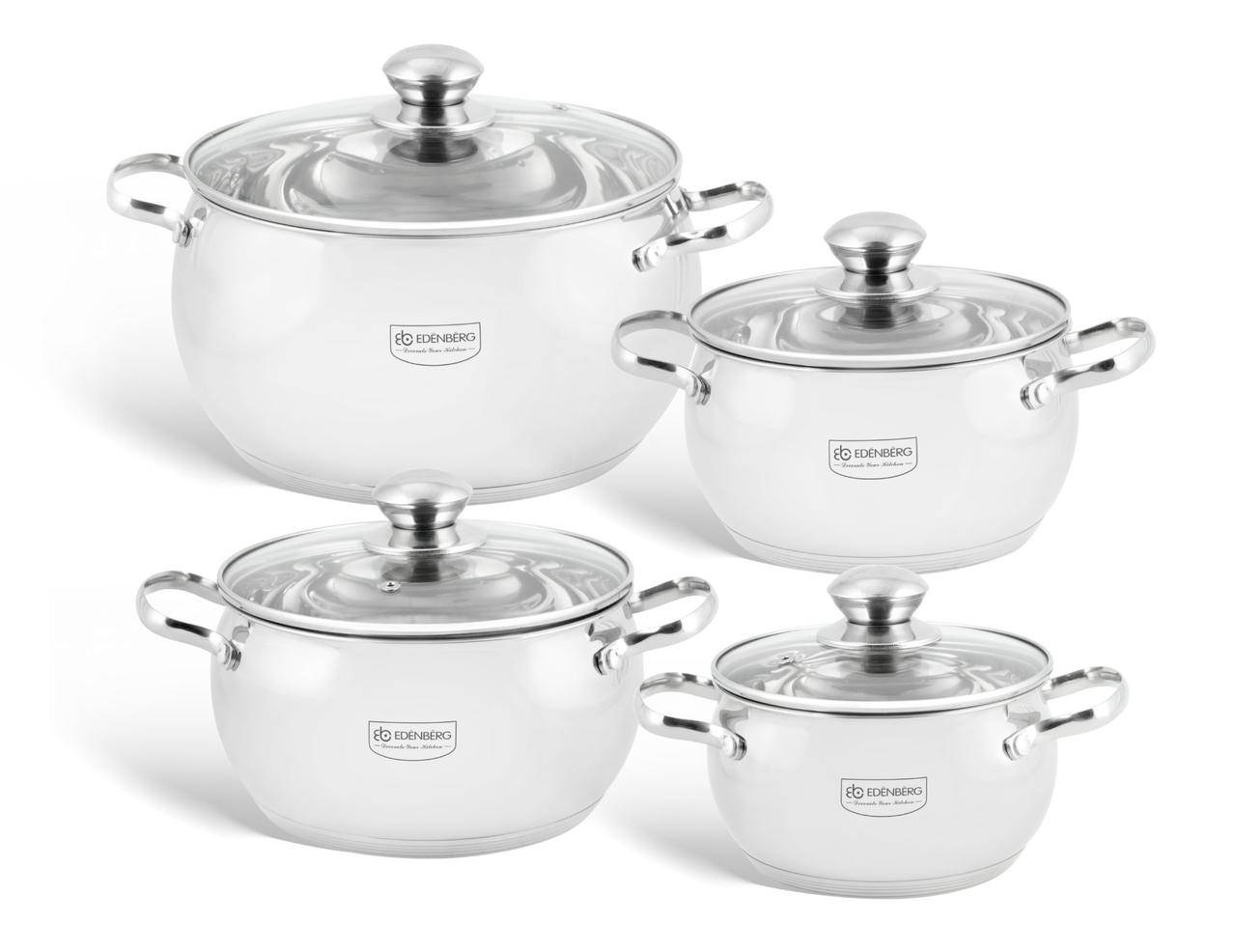 Красивую и чистую кухню тяжело представить без хорошего набора посуды. От него напрямую зависят качество и вкус блюд, а также презентабельность и процесс их приготовления. К тому же, любая хорошая хозяйка просто не позволит готовить еду для близких в старых облезлых кастрюлях. Поэтому они выбирают для себя такие модели, как Набор посуды из 8 предметов Edenberg EB-1115 из нержавеющей стали.