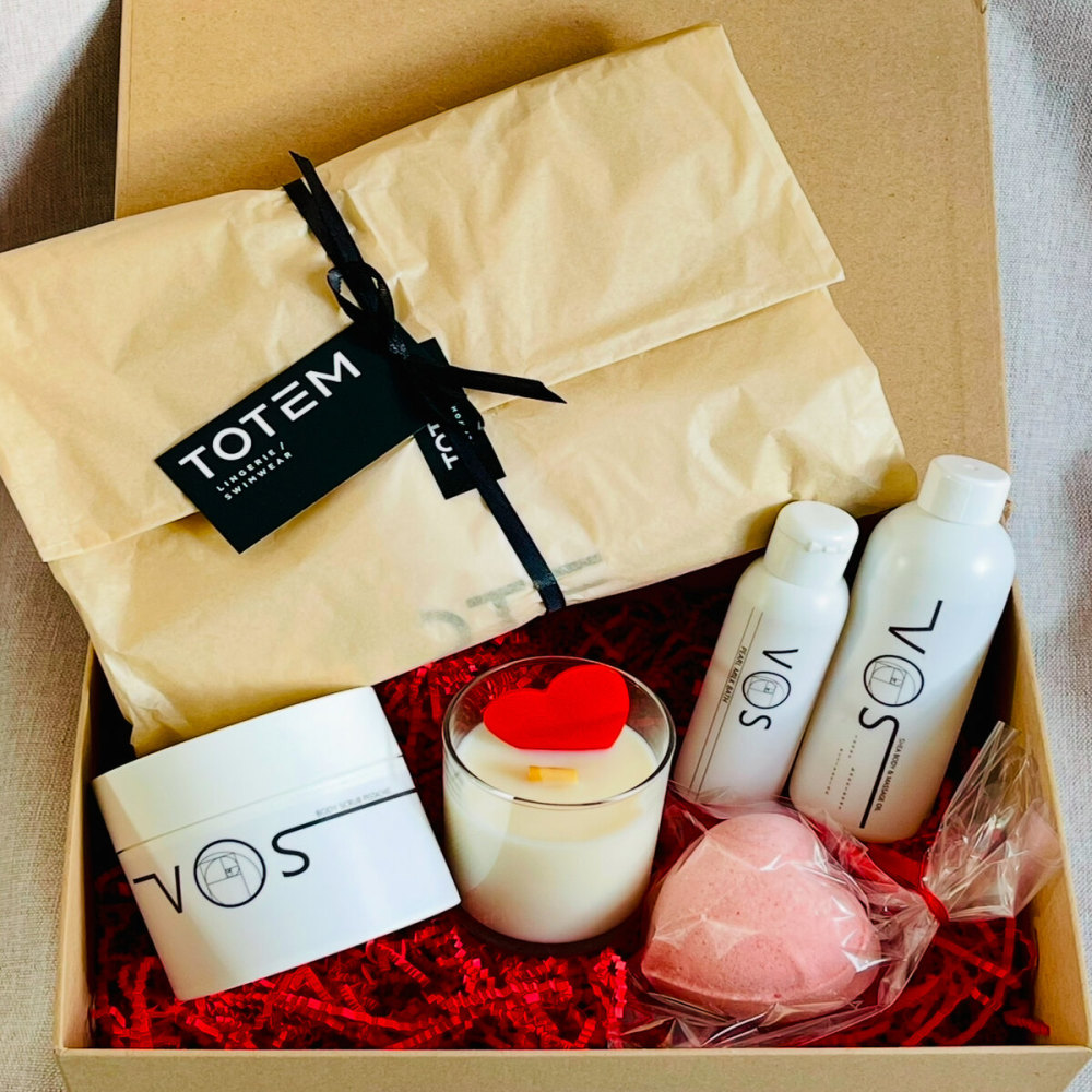 Подарочный набор содержит роскошную футболку-платье от люксового бренда Totem и ароматную уходовую косметику для тела от органического бренда VOS.