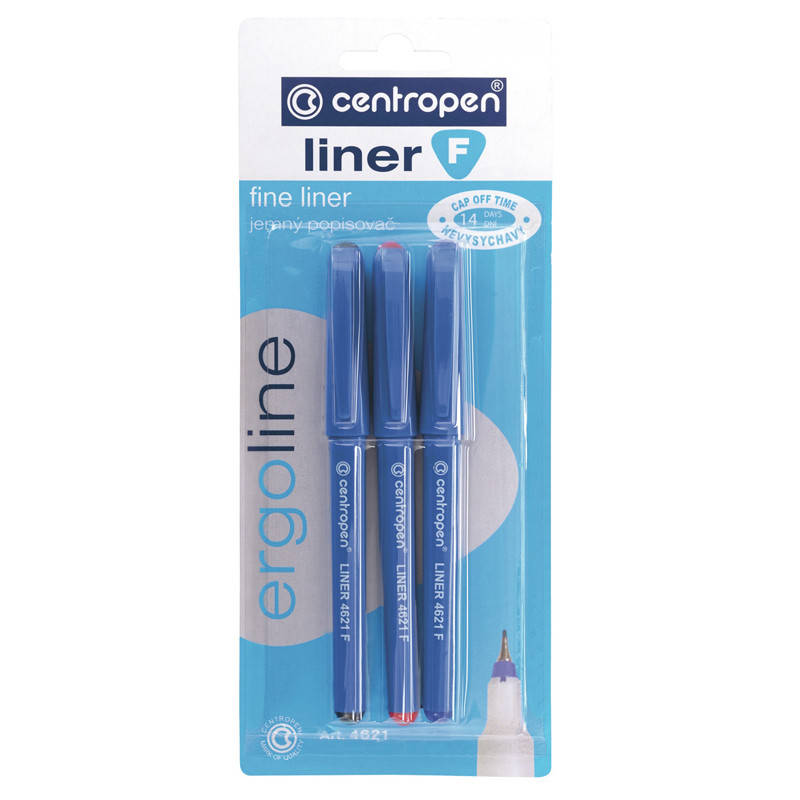 Набор линеров 4621 F ergoline, 3 цвета (синий, красный, чёрный), круглый пластиковый пишущий узел, ширина линии 0,3 мм, блистерная упаковка с европодвесом. Произведено в Чехии.