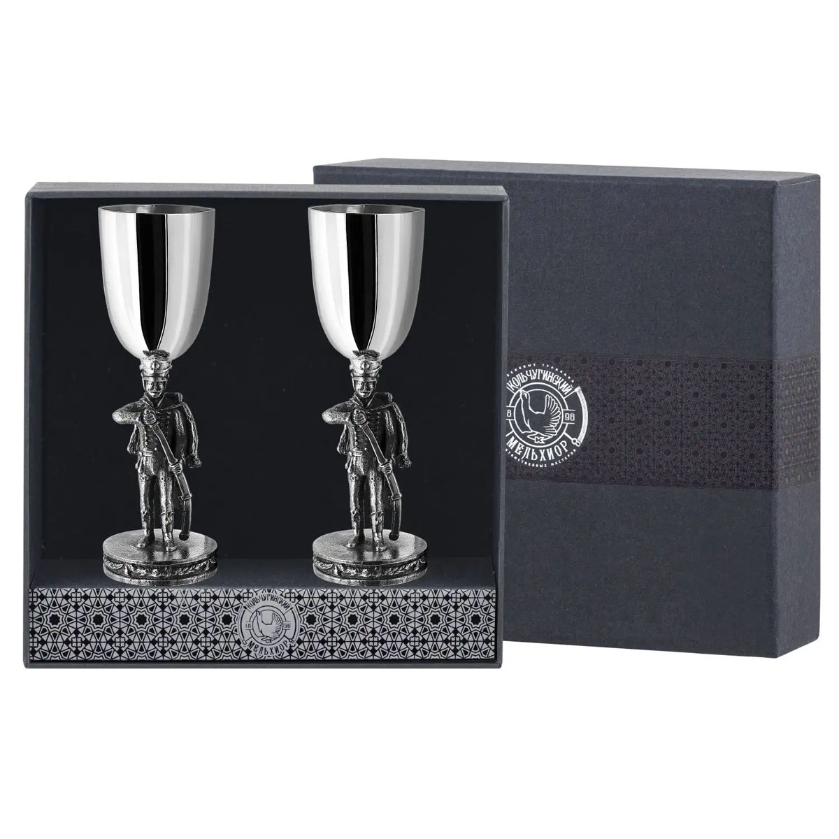 Набор рюмок Кольчугинский Мельхиор Охотничий домик Аты-Баты посеребрение с чернением 2шт в футляре