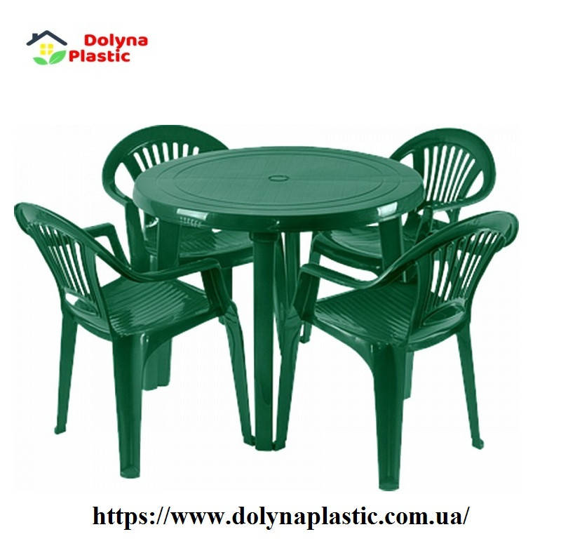 Набор садовой мебели : круглый стол и 4 стула .Пластиковые столы и стулья выполнены из легкого, непромокаемого, моющегося материала, что позволяет использовать их как в саду, на даче, так и на летних площадках в кафе. Обтекаемая спинка и удобные подлокотники стульев разработаны для комфортного отдыха. Стулья компактно складываются один в один, что облегчает хранение.