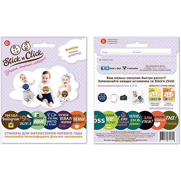 Набор забавных стикеров "Устами младенца", Stick’n Click (Стик эн Клик) – хорошая идея для неповторимой фотосессии с участием малыша. В наборе 13 наклеек диаметром 10 см. На каждой – оригинальная надпись, которая сделает незабываемой самую обычную фотографию. Просто наклейте стикер с подходящим содержанием на бодик малышу, сделайте отличное фото, поделитесь позитивом с родными и близкими.