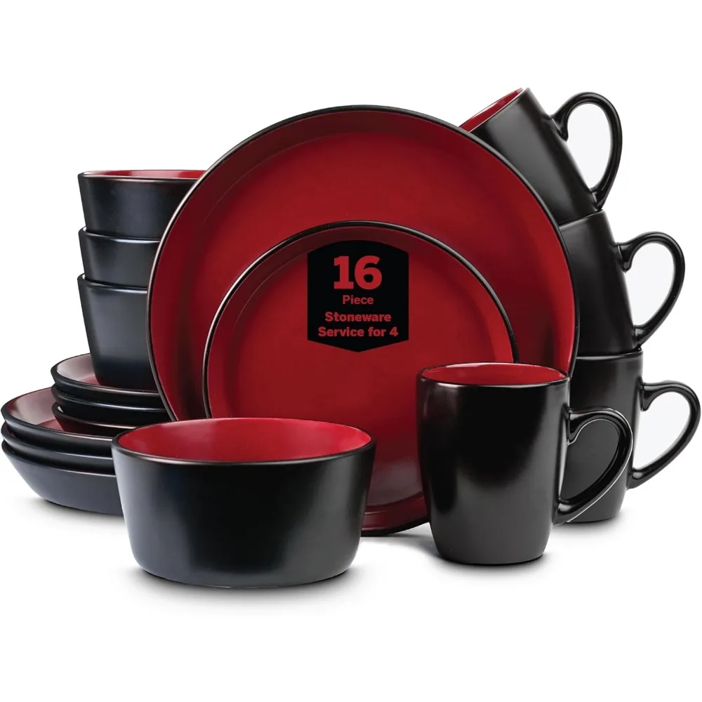 Набор столовой посуды из красного и черного камня на 4 предмета, сбор тарелок и мисок из 16 предметов, можно использовать в микроволновой печи и в посудомоечной машине.