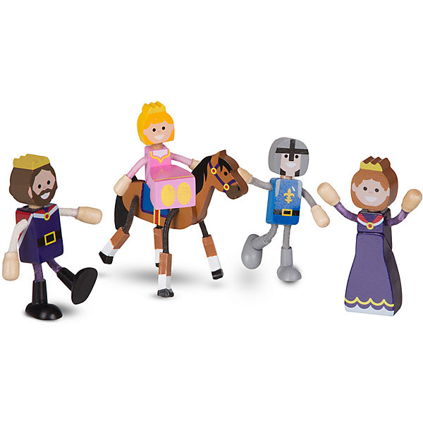 Набор деревянных фигурок изготовлен из качественных и безопасных материалов. Все персонажи имеют гибкие конечности, что позволяет их сажать, наклонять и сгибать. Фигурки принцессы и королевы с поворачивающимися юбками, за счет чего они могут ездить на лошади.