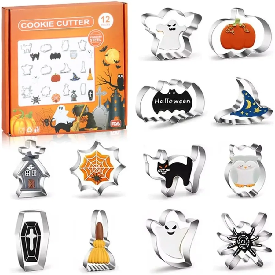Набор формочек для печенья на Хэллоуин из 12 предметов для самостоятельной выпечки: металлические формы из нержавеющей стали, включая паук, тыква, летучая мышь, кошка, призрак, череп