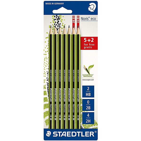 Набор чернографитовых карандашей Noris eco 18030, 7 штук в картонной упаковке с подвесом. Выгодное предложение 7 штук по цене 5 карандашей. 2 карандаша степени твердости - 2B и 2H - бесплатно. Noris eco в зелено-черных полосках сделан из материала WOPEX, инновационного композиционного материала от Staedtler из натуральных волокон. Так ценители надежного получают привычное качество вместе с хорошим чувством экологичного письма. Помимо высокой противоломкости eco обеспечивает отличное чувство письма и более длительный срок службы. Диаметр грифеля - 2 мм.