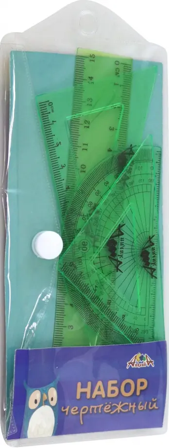Набор для черчения 4 предмета мини: линейка 15 см, треугольник 10 см, треугольник 7 см, транспортир. Предназначен для начальной и средней школы. Набор очень компактный, упакован в конверт из пленки ПВХ на кнопке - удобно носить в рюкзаке или портфеле, легко найти. Изготовлен из пластика. Линейка, треугольник и транспортир - базовые инструменты на уроках математики, геометрии, физики. Эти канцелярские принадлежности необходимый атрибут школьного портфеля ученика с 1 по 11 класс.