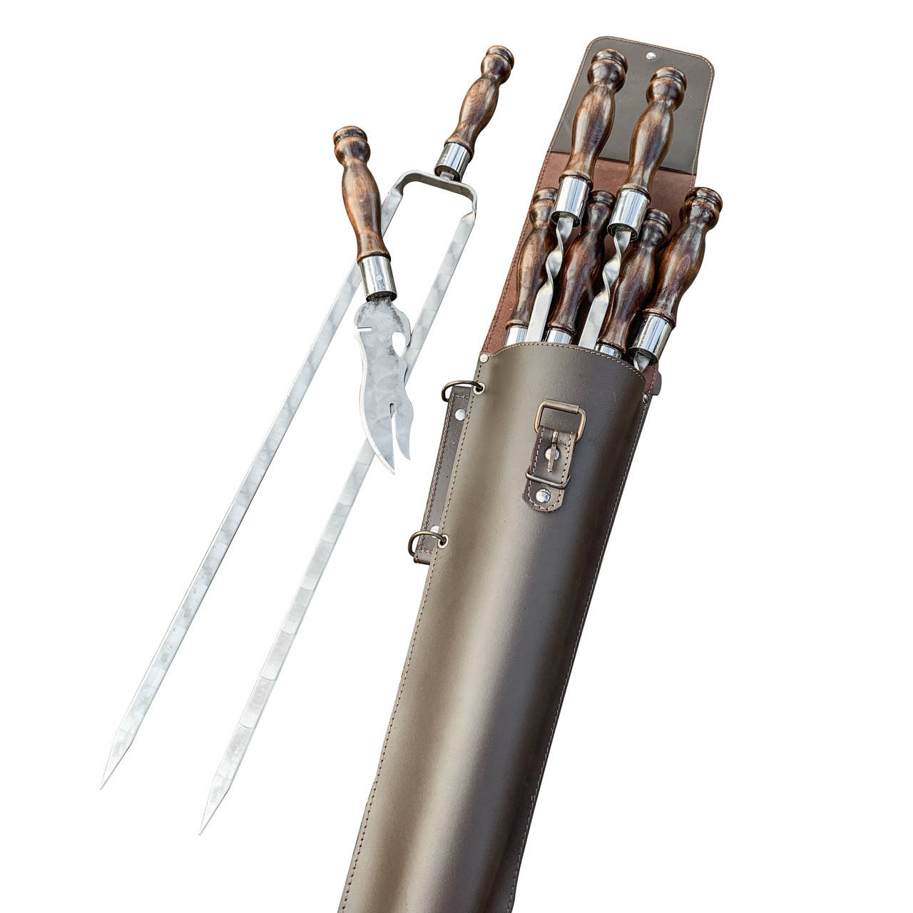 Набор шампуров "Калчан Охота" - это идеальное сочетание функциональности, качества и цены!"Калчан Охота" отлично подойдет как на подарок, так и для каждодневного использования. Все самые необходимые предметы для приготовления шашлыка в одном наборе. Чехол изготовлен из натуральной кожи. Прошит качественной ниткой. Все предметы расположены продуманно и компактно. Он не займет много места.Комплектация:Шампуры с деревянной ручкой 6шт (сталь марка AISI430; рабочая длина лезвия 40-50см; толщина лезвия 3мм!!!; ширина лезвия 12мм; ручка изготовлена из твердых пород дерева и вскрыта двумя слоями водостойкого лака)Двойной шампур-вертел (для приготовления овощей и курицы)Вилка-нож-открывалка (для снятия мяса с шампура)Чехол из натуральной кожи с тиснением!!!