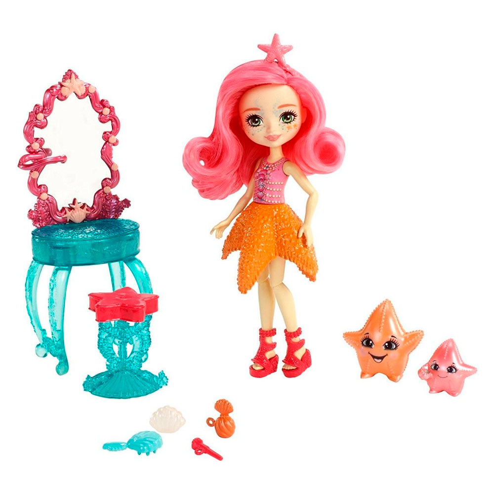 Красуня Старлінг та дві її найкращі подружки - морські зіроньки живуть у чарівному підводному світі Enchantimals. У Старлінг яскравий костюм під стать своїм улюбленицям: пишна спідниця і обідок у формі морської зірки. Навіть туалетний столик з дзеркалом і маленьким стільчиком прикрашені різнокольоровими коралами і мушлями. Допоможи ляльці привести себе до ладу, розчеши її розкішне волосся за допомогою спеціального гребеня, заплети косу, хвостик або залиш розпущеним. Воно таке м'яке, що його хочеться постійно торкатися! У набір входить: лялька; фігурки вихованців; додаткові аксесуари. Вік: 4+.