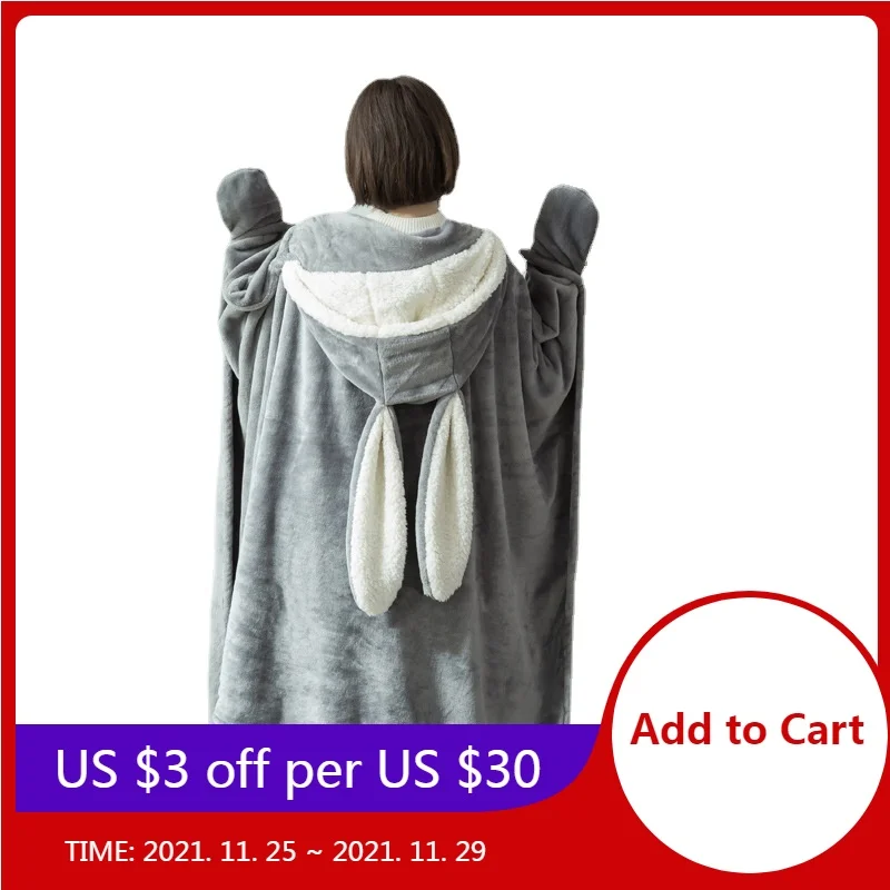 Накидка с кроличьими ушами для офиса, одеяло из овечьей шерсти, кондиционер, накидка для сна, дивана, домашняя накидка с капюшоном для ленивы...