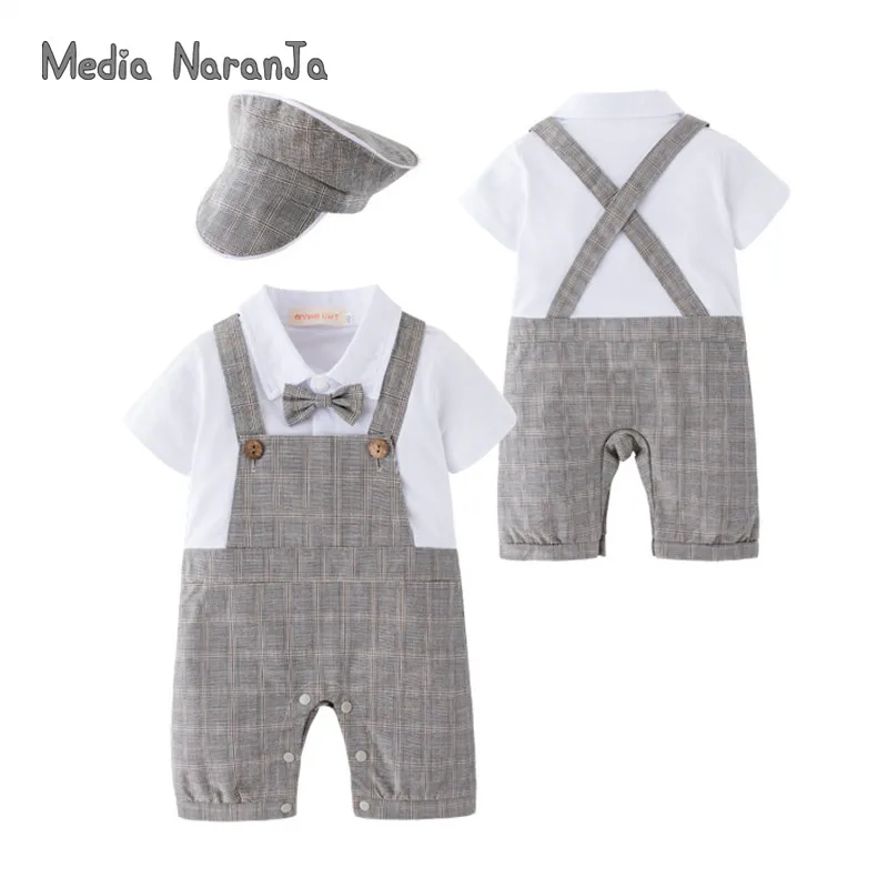 Baby boy Summer dress short-sleeved plaid gentleman jumpsuit+hat infant toddler wedding party birhthday clothes