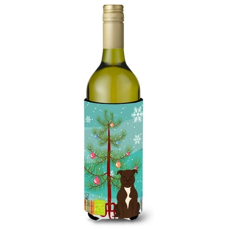 Carolines Treasures BB4173LITERK Merry Christmas Tree Staffordshire Bull Terrier Chocolate Wine Bottle Beverge Insulator
