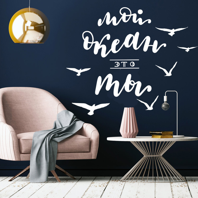Интерьерная наклейка "Мой океан - это ты" - стильное решение для декорирования вашего жилого пространства. Эта большая фраза на стену станет ярким акцентом в интерьере, добавляя в комнату атмосферу романтики и свежести.Наклейки выполнены из тонкой прочной виниловой пленки, создающей эффект авторского рисунка ручной работы на стене. Клеить можно на любые ровные чистые поверхности ( стекло, металл, пластик, кафель, дерево, окрашенные стены, нерельефные обои).При снятии следов клея на поверхности не оставляют.Размер наклейки как на фото 60 см на 65 см, но Вы при наклеивании можете разместить каждое слово и элемент на любом расстоянии друг от друга, создав таким образом свой неповторимый дизайн. Точные размеры слов и букв на следующем фото.Наклейки не боятся воды, их можно мыть мыть и клеить во влажных помещениях и на улице.Добавьте немного морского настроения в свою обстановку с этой романтичной интерьерной наклейкой.