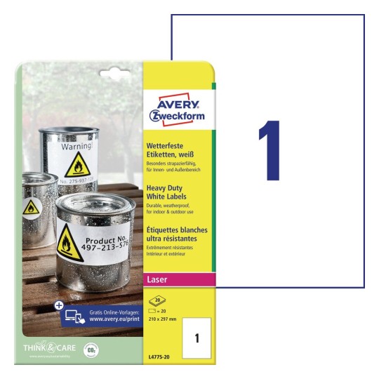 Наклейки Avery Zweckform L4775-20, односторонняя, глянцевая, 210x297мм, 1шт. на листе A4, 20л., белый (L4775-20), L4775-20