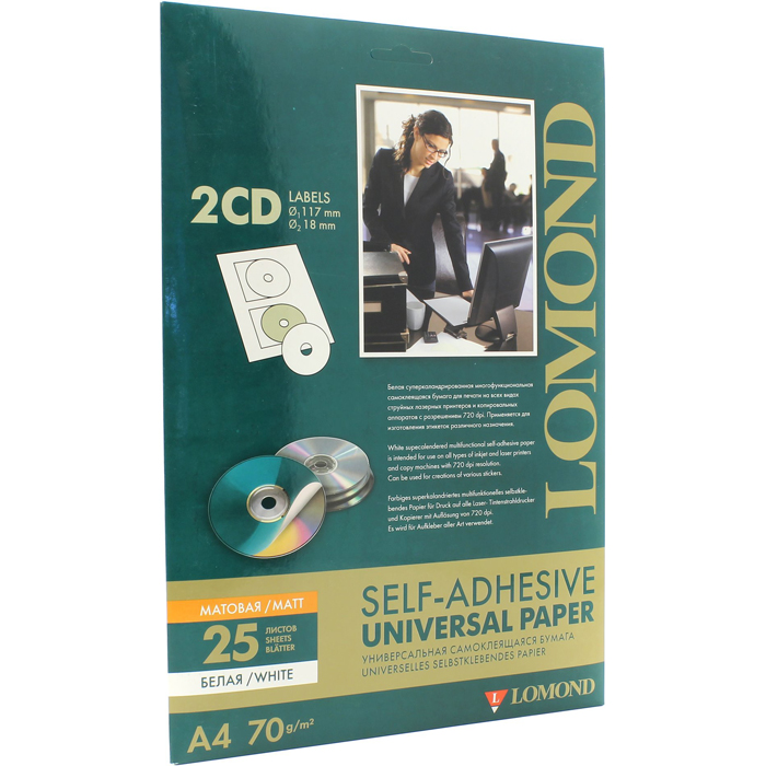 Наклейки Lomond универсальная самоклеящаяся A4, 25листов по 2 наклейки, 70г/м2, для CD (2101013), Белый