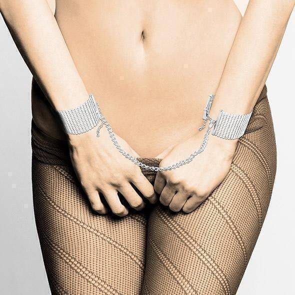 Легкие браслеты сделаны из тонких металлических чешуек серебяного цвета, соединены между собой съемной цепочкой. Этим аксессуаром любви можно дополнить романтический наряд для спальни.