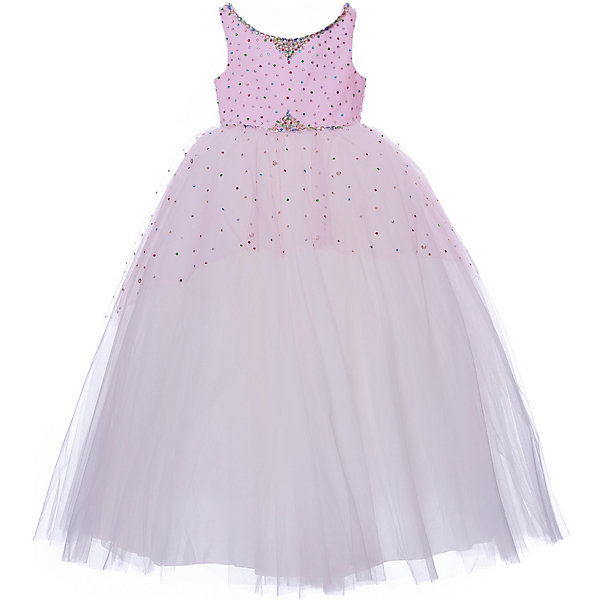Потрясающей пышности и красоты платье в бальном стиле со стразами. Закрытый цветной лиф декорирован аппликациями из стразов вокруг V-образных вырезов спереди и сзади. Такая же вставка у пояса, а вся поверхность верха расшита цветными камнями в произвольном порядке. Очень пышная белая фатиновая юбка с королевским шлейфом дополнена тонированной баской, удлиненной сзади. На ней также декор из окрашенных стразов. На спинке – застежка из пуговиц и цветочный бутон.