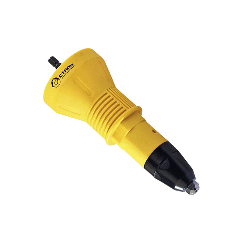 Насадка заклепочник Сталь 64042 предназначен для шуруповёрта или дрели. С помощью насадки можно скрепить поверхности заклепками из стали, алюминия или нержавеющей стали. Хвостовик шестигранный.
