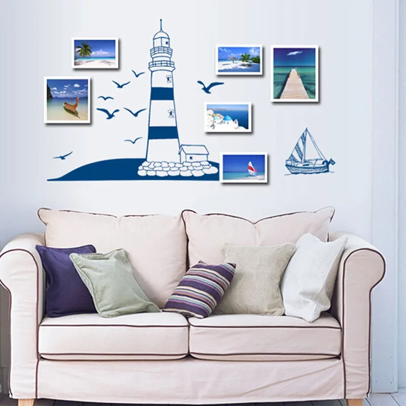 Настенные обои «сделай сам», съемные настенные Стикеры с синим океаном, парусником, лодкой, кораблем, чайкой, башней, Декор