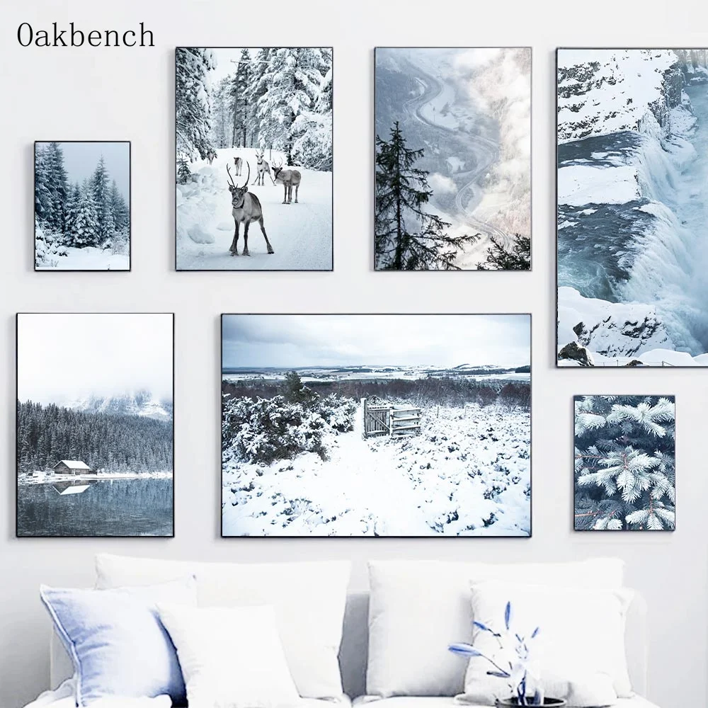 Настенный постер с природным снегом, Картина на холсте с изображением гор, озер, оленей, скандинавские картины на стену, домашний декор