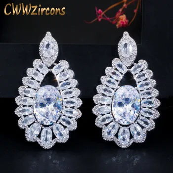 CWWZircons Sparkling Oval CZ White Crystal Silver Color Big Dangle Drop Earrings for Women Evening Dinner Party Jewelry CZ638