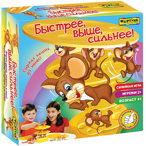 Настольная игра "Быстрее, выше, сильнее!", Фортуна от отечественного производителя, специализирующегося на данного вида играх, предназначена для веселого времяпрепровождения от двух человек. Цель игры заключается в том, чтобы построить как можно более высокую сырную башню. Элементы игры выполнены из качественного и безопасного пластика, упакованы в картонную коробку. В комплекте имеется инструкция с правилами игры.