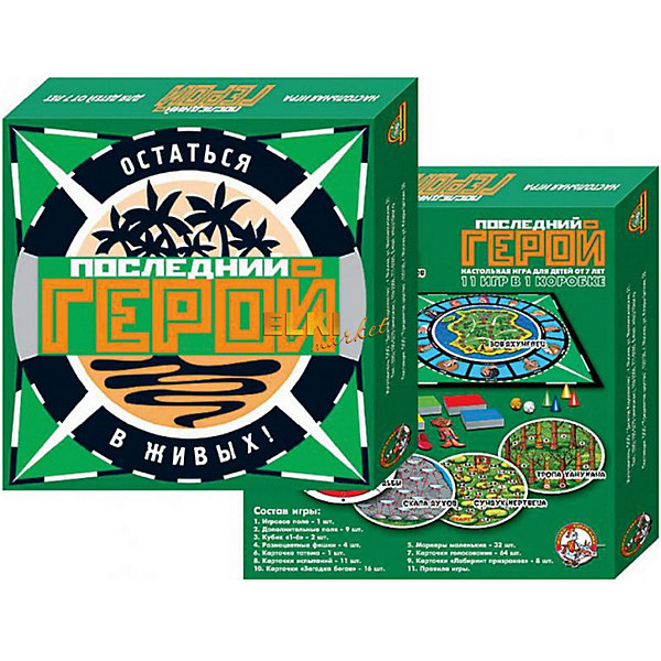 Игра настольная «Последний герой» надолго увлечет вас и вашего малыша. В комплект игры входит игровое поле, 9 дополнительных полей, 2 кубика, 4 разноцветные фишки, карточка тотема, 11 карточек испытаний, 32 маленьких маркера, 64 карточки