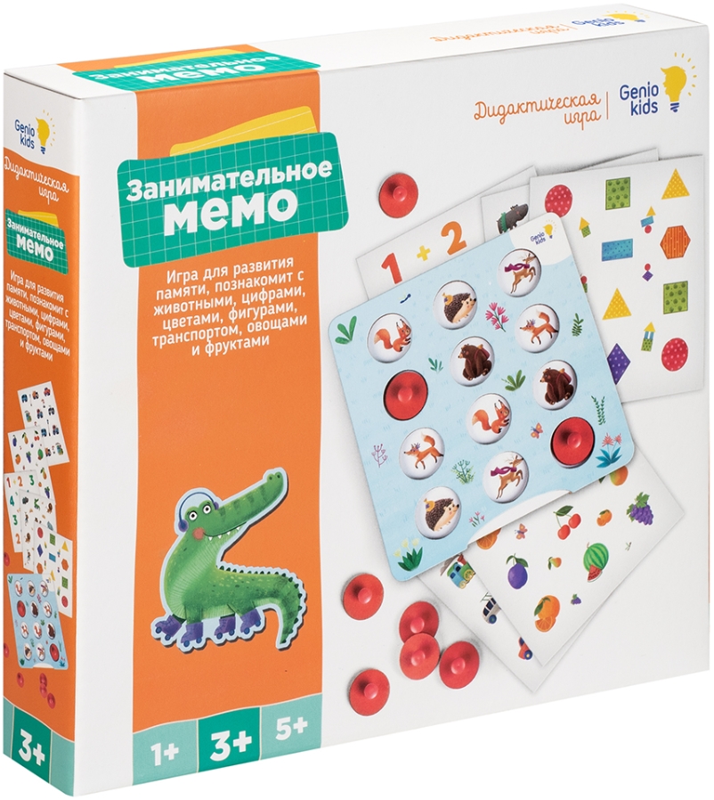 Игра Занимательное мемо включает 6 двусторонних карточек, с помощью которых легко познакомить ребенка с цифрами, названиями цветов, овощей и фруктов, названиями животных, геометрических фигур, видами транспорта. Игра способствует развитию памяти и пространственного мышления. Вставьте карточку в планшет, запомните расположение картинок, закройте картинки фишками, найдите парные картинки по памяти, открывая по две фишки.