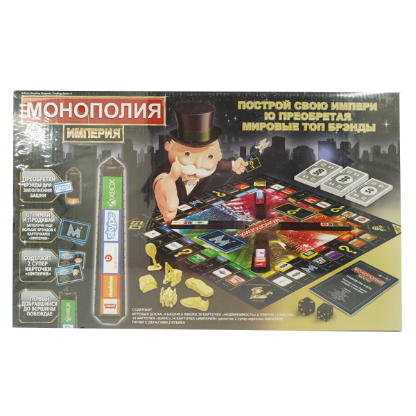 [html]Настольная играМонополия ИмперияКаждый пятый житель планеты знает настольную игруМонополия. Игра в Монополия Империя для компании друзей будет отличнымразвлечением! Мечтали стать владельцем мировой империи? Теперь Ваша мечтаосуществится! Игра Монополия Империя дает Вам такой шанс! Играя: продавая ипокупая бренды Вы строите свою башню Империи. Сначала выберите один из шестифирменных знаков, затем, перемещаясь по игровому полю, покупайте любые бренды,которые Вам понравятся! В свою башню империи поместите фирменный рекламныйщит. Продавайте, покупайте и берите бренды с Золотыми картами"Империя" и картами "Шанс". Победитель в игре тот, ктопервым построит свою империю!Размеры упаковки 44*27*5 см Комплектация:-Игровое поле,-Карточки "Шанс 14шт",-Карточки "Империя 14шт",-Деньги монополии,-Игровые кубики 2 шт.,-Фишки 6шт,-Башни,-Логотипы брендов,-Инструкция.[/html]