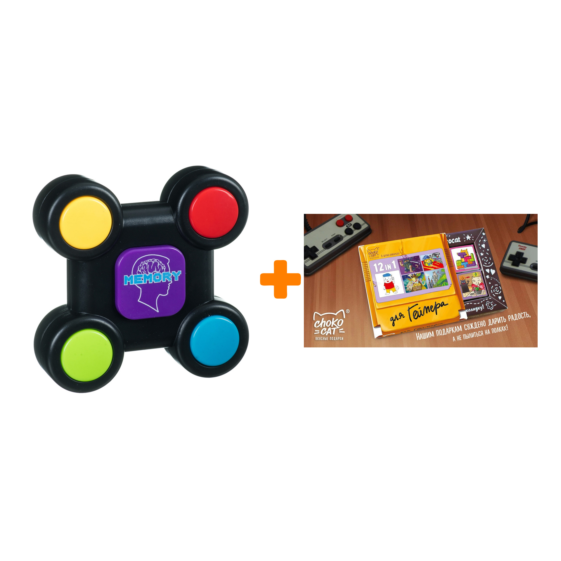 В состав набора входят:Шоколад Кэт 12: Для геймера (60 г), Настольная игра На памятьШоколад Кэт 12: Для геймера (60 г):Угадай игру! Набор основан на реальных игровых событиях!Настольная игра На память:Следите за тем, в каком порядке загораются кнопки, а затем правильно повторите последовательность загоравшихся цветов! Отличная игра, тренирующая память. В комплекте 2 батарейки АА.