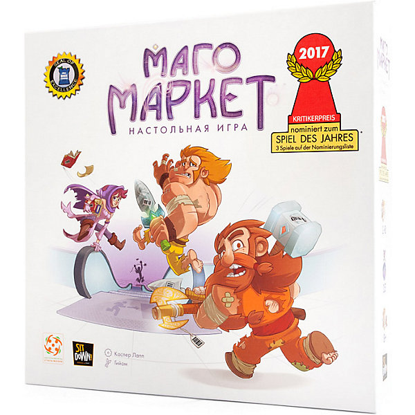 • в наборе: 24 тайла торгового центра, 4 фишки героев разных цветов, 12 жетонов «недоступно», 9 тайлов действий для игры с 2-8 участниками и 7 тайлов действия для одиночного режима игры, песочные часы на 3 минуты, фишка «сделай что-нибудь», таблица для подсчёта очков, тайл похищения, набор наклеек, правила