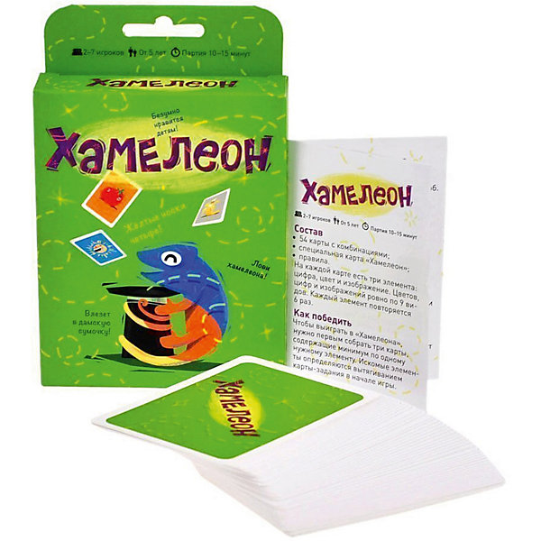 • комплектация: 54 карты с комбинациями рисунков, цифр и цветов; специальная карта «Хамелеон», правила на русском языке.