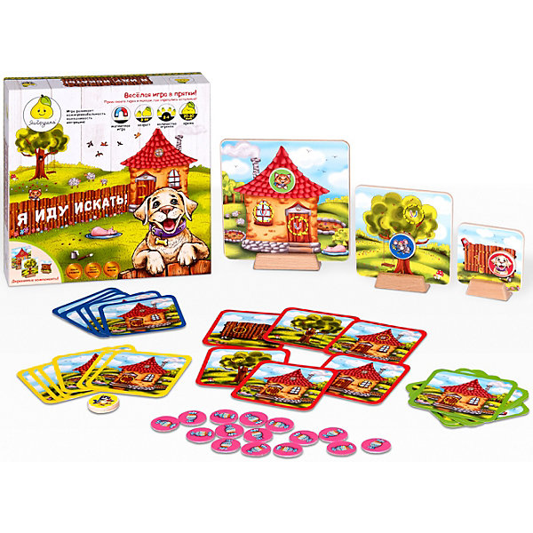 • в наборе: домик, дерево, заборчик, 4 жетона с персонажами, 24 карточки расположения, 40 призовых жетонов, правила игры