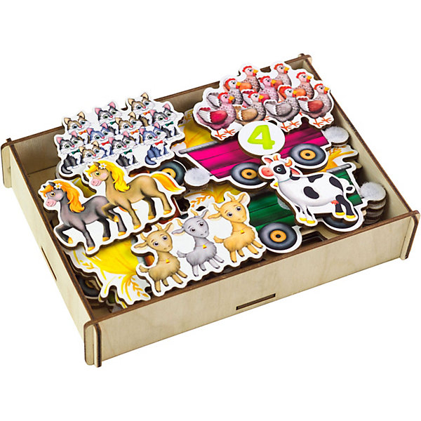 • в комплекте: 1 ящик для хранения материала, 1 трактор с липучками, 10 фургончиков с липучками для перевозки животных, фигурки животных с липучками по количеству от 1 до 10, цифры на липучках от 1 до 10