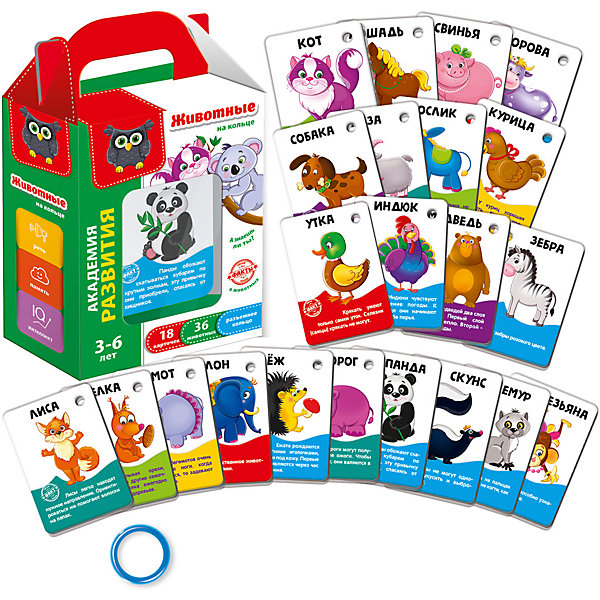 • в наборе: 18 карточек, 36 животных, разъемное пластиковое кольцо
