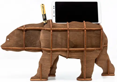 Настольный органайзер Медведь, коричневый. Сборная деревянная модель, Серый