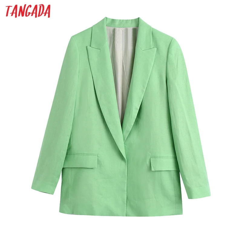 Tangada Women 2021 Fashion Green Linen Blazer Coat Vintage Long Sleeve Flap Pockets Female Outerwear BE124