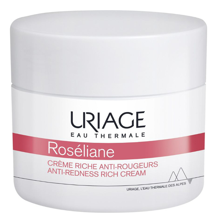 От производителя: Крем Roseliane Anti-Redness Rich Cream от Uriage предназначен для ухода за кожей лица, склонной к чрезмерной сухости, проявлениям розацеа и купероза. Ухаживающий продукт с гипоаллергенной формулой, разработанной специалистами собственной лаборатории бренда Uriage, позволяет эффективно справиться с аллергическими высыпаниями, покраснениями и воспалением кожных покровов, способствует устранению зуда, жжения, покалываний, укрепляет и сужает стенки кровеносных сосудов, предотвращая появление «сеточек» и «звездочек», характерных для купероза. SK5R комплекс обеспечивает регуляцию протеазы, заметное осветление красных пятен. Компоненты TLR2-Regul и Церастерол -2F укрепляют местный иммунитет, усиливают сопротивляемость кожи перед вредоносными микроорганизмами. Термальная вода эффективно снимает воспаление, насыщает клетки полезными микроэлементами, активизирует процессы регенерации тканей. Масло ши интенсивно питает клетки, устраняет сухость и шелушения, запускает процесс производства собственных коллагеновых волокон. В состав продукта также введены зеленоватые перламутровые частицы, которые обеспечивают косметический эффект маскировки красных пятен. Способ применения: Наносить 1 раз в день на предварительно очищенную кожу лица, избегая области вокруг глаз. Подходит для использования в качестве основы под макияж. Состав: Насыщенный крем для лица против покраснений Uriage Roseliane Anti-Redness Rich Cream содержит: Aqua (Water, Eau), Propylheptyl Carpylate, Butyrospermum Parkii (Shea Butter), Cetearyl Isononoate, Cetyl Alcohol, Ptfe, Hydrogenated Polydecene, Squalane, Butylene Glycol, Diglycerin, Dimethicone, Glycerin, Steareth-21, Pentaerythrityl Distearate, Sodium Polyacrylate, Phenoxyethanol, Brassica Campestris (Rapeseed) Sterols, Parfum (Fragrance), Raspberry Seed Oil/Palm Oil Aminopropanediol Esters, Steareth-2, Titanium Dioxide, Mica, Chlorphenesin, Tocopheryl Acetate, Acrylates/C10-30 Alkyl Acrylate Crosspolymer, Citric Acid, o-Cymen-5-Ol, Xanthan Gum, Panax Ginseng Root Extract, Biosaccharide Gum-1, Asiaticoside, Phytosphingosine, Sorbitol, Maltodextrin, Ascophyllum Nodosum Extract, CI 14700 (Red 4), Aspagopsis Armata Extract, Potassium Sorbate.