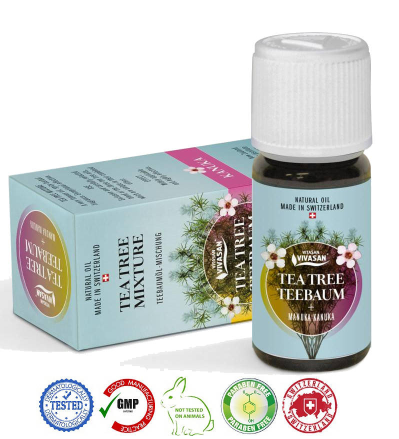Применение масла чайного дерева: смесь масел чайного дерева, мануки и кануки от Vivasan оказывает сильное дезинфицирующее воздействие и может применяться в качестве натурального поливалентного антибиотика для борьбы практически с любыми бактериями, грибками и вирусами. С 1970-х годов с ростом проблем невосприимчивости к антибиотикам это масло получило распространение в научной медицине как надежный помощник, а также полюбилось людьми как "самая маленькая аптека в мире".