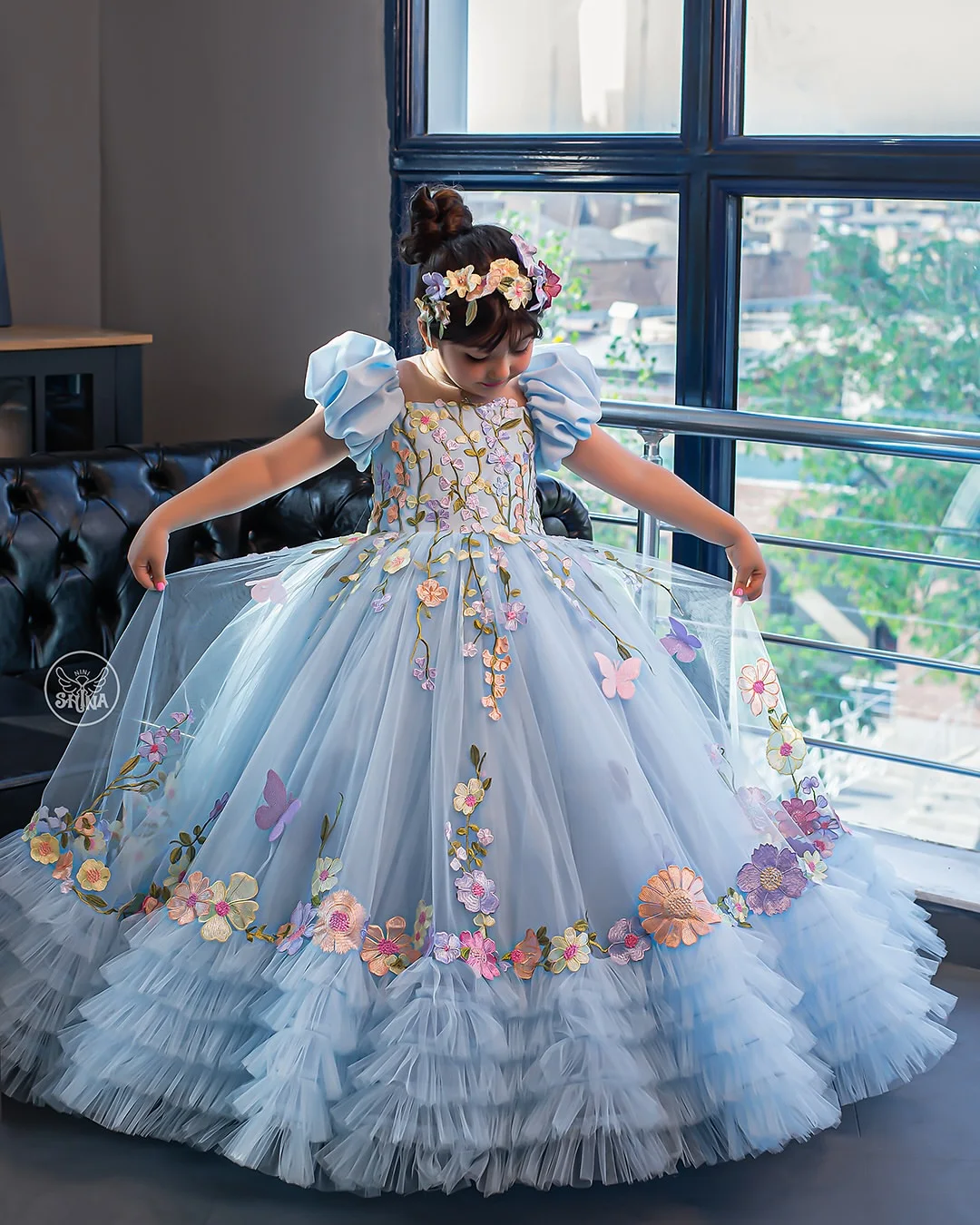 Небесно-голубое платье с цветочным узором для девочек с пышными рукавами и цветочным принтом. Роскошные пышные платья для девочек. Длина пола. Многоуровневое платье из тюля для дня рождения.