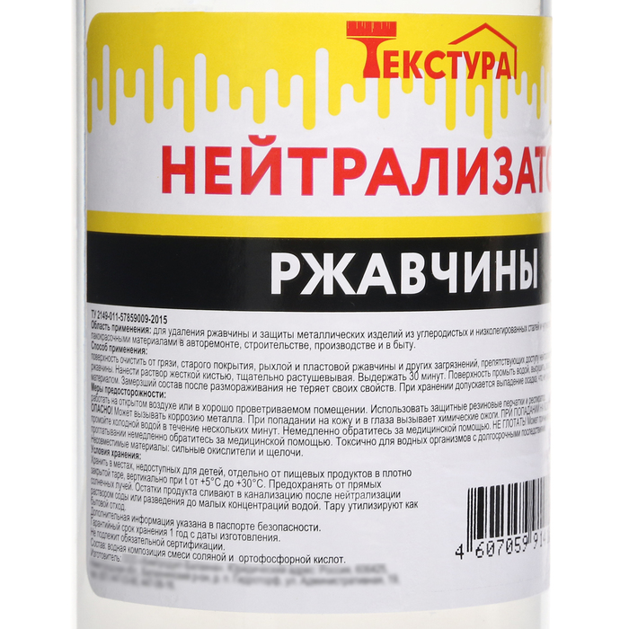 Нейтрализатор ржавчины “Текстура” - это эффективное средство для удаления коррозии с металлических поверхностей. Он поставляется в бутылке с триггером, объемом 0,5 литра и легко наносится на поверхность. Нейтрализатор ржавчины обладает высокой проникающей способностью, что позволяет ему быстро и эффективно удалять ржавчину и другие загрязнения с поверхности металла. Он также создает защитную пленку на поверхности металла, которая предотвращает появление коррозии в будущем.“Текстура” подходит для использования на различных металлических поверхностях, включая сталь, чугун, алюминий и другие металлы. Он может использоваться как для профессионального, так и для бытового применения, и является безопасным для использования на окрашенных поверхностях. Применение нейтрализатора ржавчины “Текстура” помогает продлить срок службы металлических изделий, улучшить их внешний вид и предотвратить коррозию. Он также может использоваться для обработки сварных швов и других мест, подверженных коррозии.