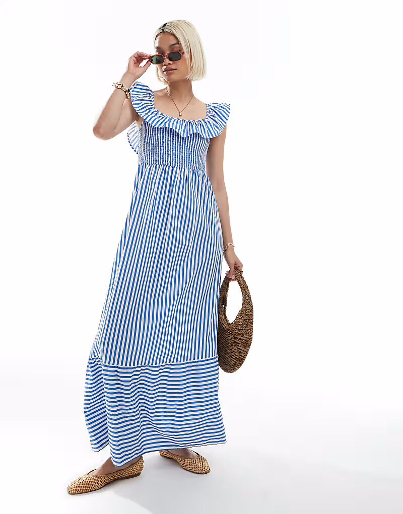 Длинное платье Vero Moda с присборенным лифом, рукавами-оборками и принтом в сине-белую полоску