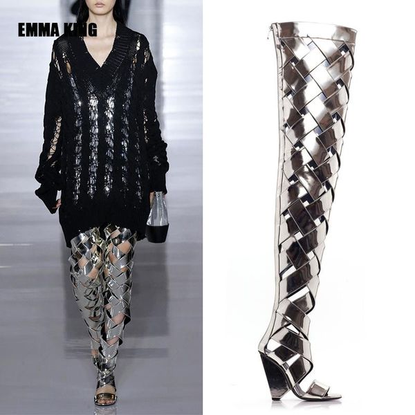 boots 2021 women pantent leather over the knee ladies hollow out catwalk shoes high heels for big size, Black