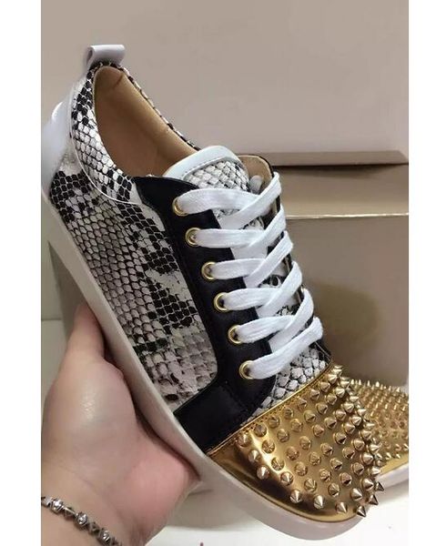 Низкий верх из змеиной кожи золота Шипы Повседневная обувь на плоской подошве с к