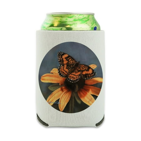 Pearl Crescent Butterfly on a Yellow Flower Can Cooler - Drink Sleeve Hugger Collapsible Insulator - Beverage Insulated Holder