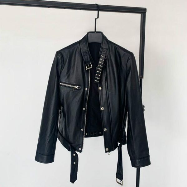 women's leather & faux stand collar jacket women 2021 spring sheep short rivet locomotive slimming coat, Black