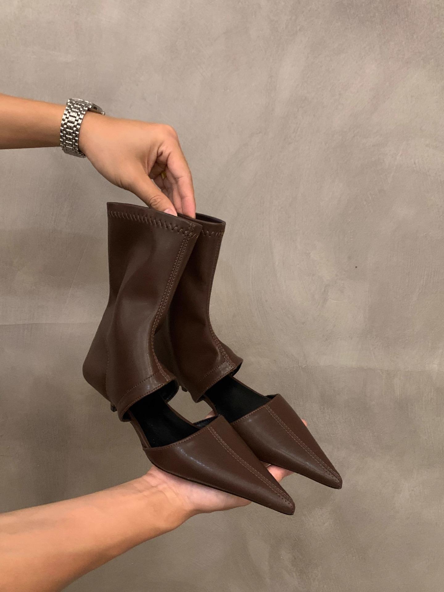 Нишевые остроносые эластичные тонкие короткие ботильоны женские ботинки 2025 новая летняя тонкая ажурная модель на маленьком каблуке крутые ботинки 40 коричневый
