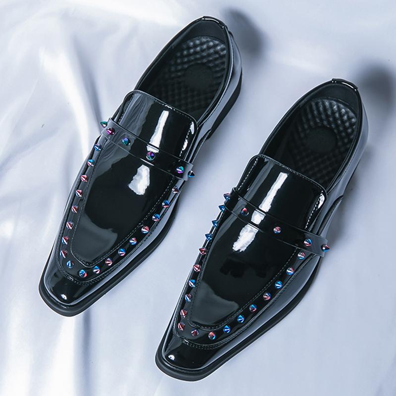 Новая Мода Мужской Шарм Острый Носок Панк Клепки Зеркальная Кожа Обувь Мужская Наряд Свадьба Выпускной Вечер Вечер Возвращения Домой Лоферы Обувь 38