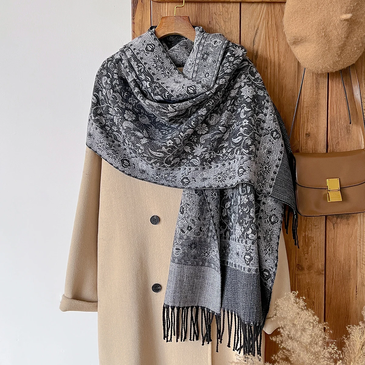 Новая брендовая зимняя женская толстая шаль из пашмины в национальном стиле с цветочным принтом и пончо - теплый длинный шарф с кисточками и палантины-пончо