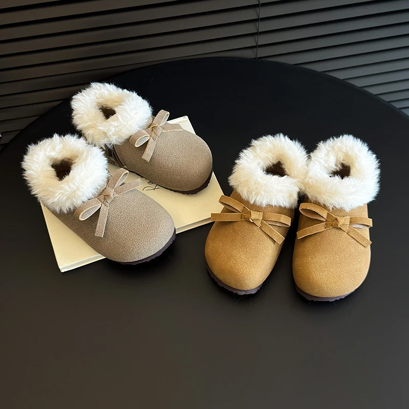 Новая детская плюшевая обувь, зимняя хлопковая обувь с милым бантом для девочек, универсальная уличная детская повседневная обувь на плоской подошве, теплая пушистая меховая обувь 2025